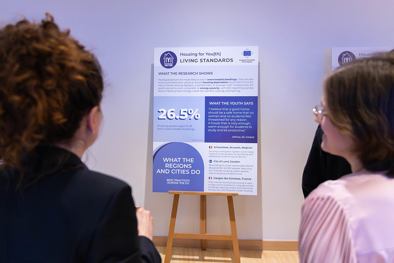L’exposition «[Y] Factor: Un logement pour les jeunes» a mis en évidence les défis en matière de logement auxquels les jeunes sont confrontés dans toute l’Europe, au moyen de cinq thèmes clés: le caractère abordable, le niveau de vie, les pressions exercées par le tourisme, les défis ruraux et la discrimination. Pour ce projet, nous avons mené des recherches sur chaque thème, en recueillant des données, des bonnes pratiques de collectivités locales et régionales ainsi que des témoignages de jeunes concernés. L’exposition, présentée du 2 au 11 février au foyer 5 du bâtiment JDE, a permis de présenter des données, des témoignages et des solutions dans un format accessible. Lors d’une réception de lancement tenue le 3 février, les visiteurs ont été invités à s’informer sur le projet, à échanger des idées et à faire part de leurs points de vue dans le cadre du débat en cours sur le logement des jeunes dans l’UE. Les travaux à l’origine de l’exposition ont également été partagés sous la forme de publications sur les médias sociaux, afin d’associer un public plus large de jeunes et d’encourager la participation.
